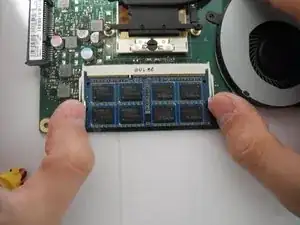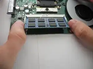 Ослабьте фиксирующие скобы по обеим сторонам модуля оперативной памяти и выдвиньте её под углом 45 градусов вверх и наружу.