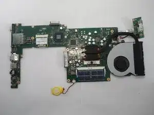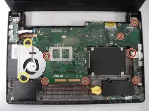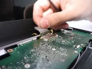 Отвинтите семь винтов 3 мм, удерживающих материнскую плату, крестовой отвёрткой Phillips #1. Эти винты отмечены белыми стрелками на плате (на фото не показано).