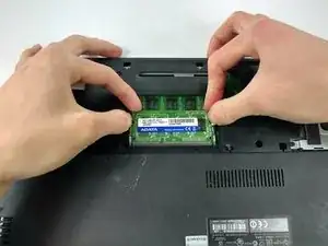 Большими пальцами отведите две металлические защёлки (по одной с каждой стороны) наружу, пока модуль оперативной памяти не выскочит.