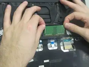 Удалите ОЗУ из ноутбука, подняв ее из слота.