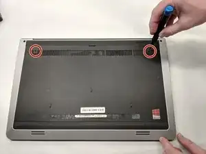 Отвинтите два винта M2.5 x 5 мм на нижней панели ноутбука крестовой отвёрткой Phillips #0, как показано.