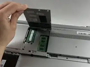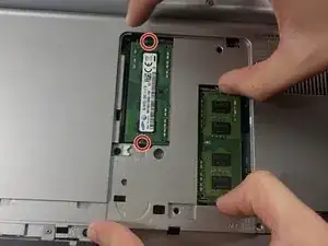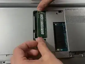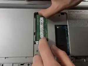 Удалите первый модуль памяти, отодвинув два фиксирующих штифта в стороны и вытянув модуль из корпуса.