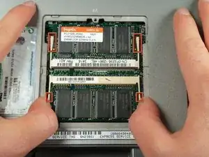 Отстегните белые пластиковые зажимы с обеих сторон оперативной памяти, чтобы она поднялась вверх.