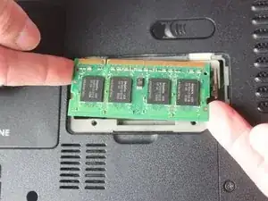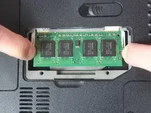 С помощью пальцев откройте и снимите дверь доступа с ноутбука, обнажив оперативную память под ней.