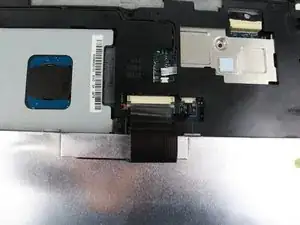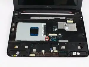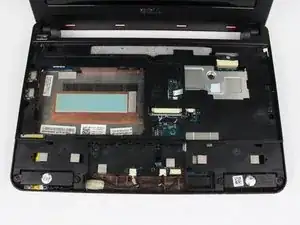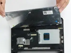 Осторожно снимайте панель под ладонь с основания компьютера — она всё ещё подключена кабелем; чтобы избежать повреждений, действуйте аккуратно.