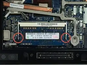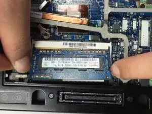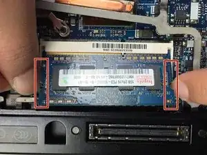 Осторожно надавите наружу на защелки, чтобы освободить оперативную память. Это позволит полностью извлечь RAM из устройства.