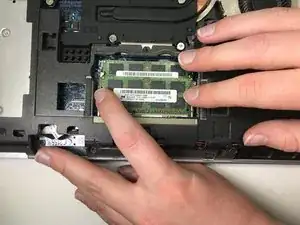 Извлеките модуль памяти, аккуратно раздвинув металлические защёлки с каждой стороны.