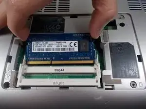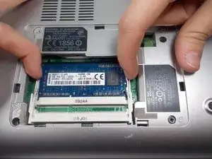 Для установки оперативной памяти вставьте модуль в освобождённый разъём и нажмите вниз на пружинные защёлки. Затем установите панель назад, выполнив указания в обратном порядке.