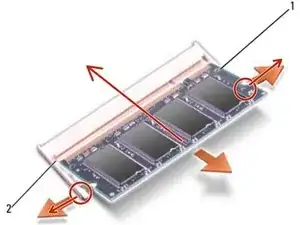 Осторожно раздвиньте фиксирующие зажимы с каждого конца разъема модуля памяти, пока модуль не поднимется.