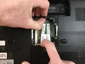Чтобы установить новый модуль оперативной памяти, вставьте его в разъём и нажмите вниз до щелчка металлических защёлок, удерживающих его на месте. После этого выполните шаги 1-3 в обратном порядке.