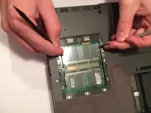 Одновременно отодвиньте каждый металлический и пластиковый зажим к центру модуля оперативной памяти.