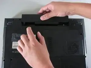 Сдвиньте задвижку слева прямо под аккумулятором, чтобы разблокировать, и вытяните аккумулятор, как показано.