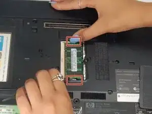 Сдвиньте защёлки, удерживающие модуль памяти, в сторону пальцами или инструментом.