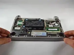 Держа рычаг вправо, аккуратно поднимите нижнюю крышку ноутбука и снимите крышку.