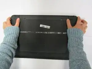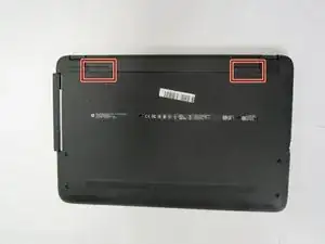 Переверните ноутбук так, чтобы аккумулятор был виден; он будет находиться рядом с петлями в верхнем левом и правом углах.