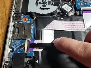 Поднимите вверх чёрные защёлки, к которым прикреплён фиолетовый шлейф.