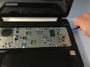 С помощью пластикового монтажного инструмента отпустите защелки клавиатуры.