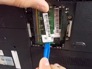Осторожно поднимите модуль оперативной памяти и извлеките его из гнезда.