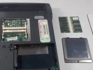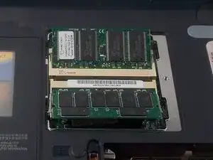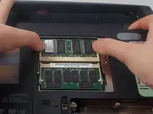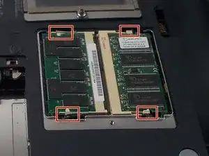 Под крышкой находятся модули оперативной памяти. Каждый из них закреплен двумя пластиковыми зажимами. Найдите их для продолжения снятия.