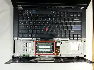 Переверните компьютер так, чтобы был виден фиксатор аккумулятора, расположенный в верхней части Thinkpad.