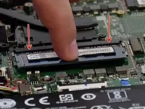 Совместите выемку на новом модуле с соответствующим выступом в слоте оперативной памяти устройства, как показано на предыдущем шаге.