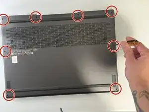 Открутите восемь винтов с нижней панели ноутбука с помощью отвёртки Phillips #0.