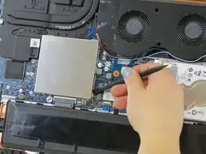Переверните ноутбук на бок и вставьте лопатку между нижней панелью и шасси, затем подденьте по периметру, пока нижняя панель не освободится.