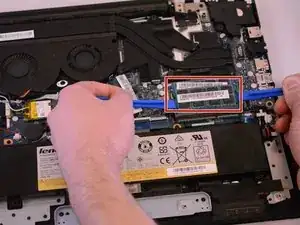 Используйте пальцы или две синие лопатки, чтобы слегка отвести зажимы от оперативной памяти, освобождая первый модуль.