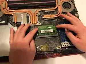 Извлеките старую планку оперативной памяти, потянув её назад и вверх.