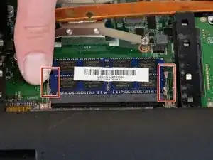 Нажмите на вкладки по бокам оперативной памяти, чтобы снять её.