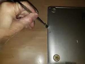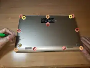 С помощью отвертки Philips #000 удалите двенадцать винтов с нижней крышки ноутбука.