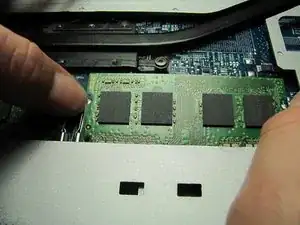 Аккуратно разожмите защелки на концах модуля памяти, пока модуль памяти не поднимется.