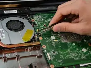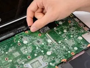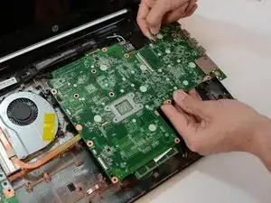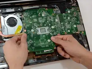 Когда это будет сделано, возьмите материнскую плату за левую сторону и аккуратно потяните, пока она полностью не освободится. Не вытаскивайте ее слишком далеко.