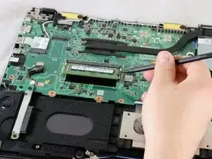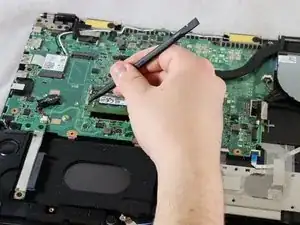 Для более лёгкого снятия начните поддевание с одного из передних углов и проведите инструмент под крышкой против часовой стрелки (влево) в направлении петли ноутбука.