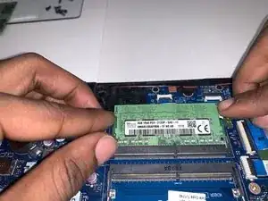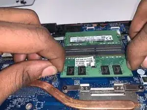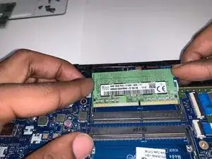 Одновременно используйте указательный палец, чтобы подать модуль оперативной памяти к себе.