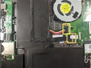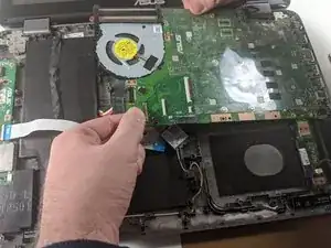 Подняв панель клавиатуры, отсоедините два ленточных кабеля от материнской платы, используя синие язычки на кабелях.