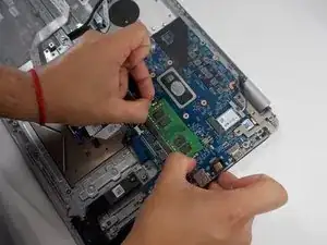 Отсоедините контактную перемычку материнской платы от верхнего левого угла аккумулятора.