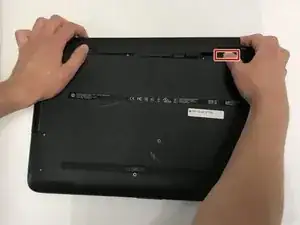 Положите ноутбук задней панелью вверх, а отсек аккумулятора — от себя.