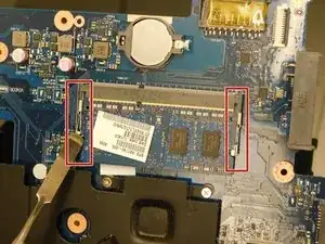Извлеките модуль оперативной памяти, одновременно отводя в стороны две пружинящие защёлки, удерживающие модуль.