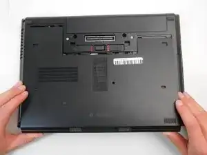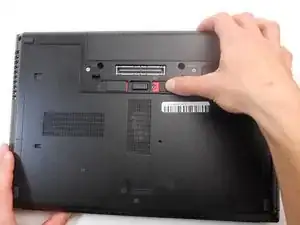 Сдвиньте заднюю крышку ноутбука от фиксирующих защёлок, пока её можно будет приподнять.