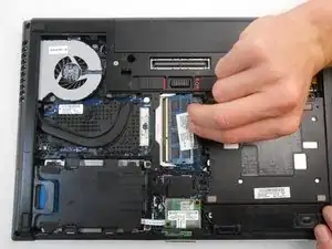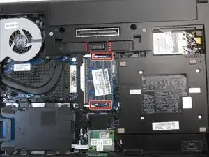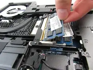 Выньте модуль оперативной памяти, потянув его прямо наружу, затем проделайте то же самое со вторым модулем.