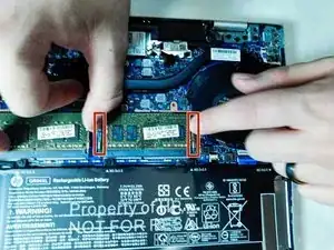 Аккуратно отведите защёлки по краям планки оперативной памяти пальцами, чтобы освободить её.