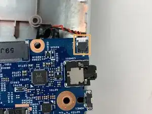Поднимите материнскую плату и переверните в вашу сторону, чтобы отсоединить дополнительный кабельный разъём на задней стороне.