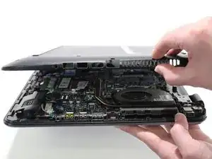 Используйте инструмент iFixit для открывания, чтобы отделить заднюю крышку от корпуса ноутбука.