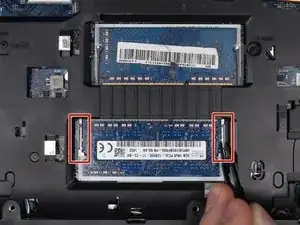 Используйте пинцет, чтобы отвести в стороны два серебристых фиксирующих зажима по обеим сторонам модуля оперативной памяти.