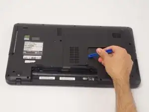 Вставьте пластиковый инструмент для открытия между задней панелью и крышкой отсека жёсткого диска/оперативной памяти рядом с винтом.