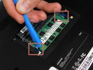 Используйте подбивающий инструмент, чтобы освободить зажимы с обеих сторон чипа оперативной памяти.