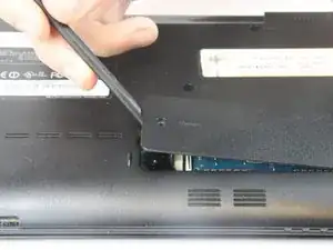 Наконец, подденьте чёрной лопаткой ослабленный модуль оперативной памяти и аккуратно потяните его вверх и наружу из ноутбука.