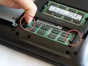 Платы оперативной памяти каждая удерживается парой пружинных защелок (обозначенных красными кругами), которые необходимо отвязать.
