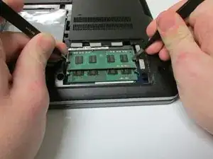 Одновременно нажмите на обе стороны механизма блокировки с помощью пинцета, чтобы извлечь оперативную память.